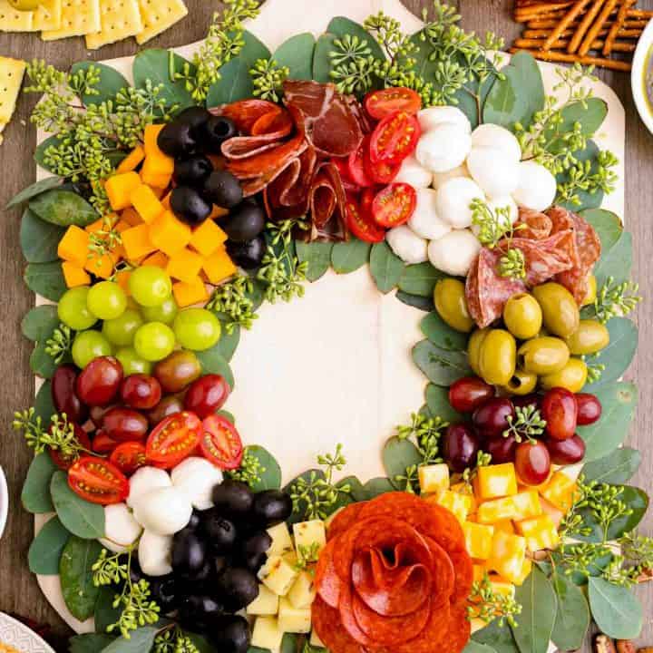- Large round platter or cutting board: The base of your charcuterie wreath should be a large circular platter or cutting board.