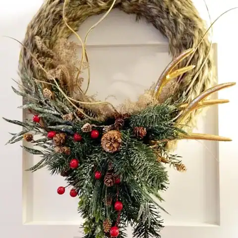 Add a trendy touch to your holiday decor with a faux fur antler wreath. This chic design combines soft textures and rustic elements for a modern yet cozy feel that’s perfect for the winter season.