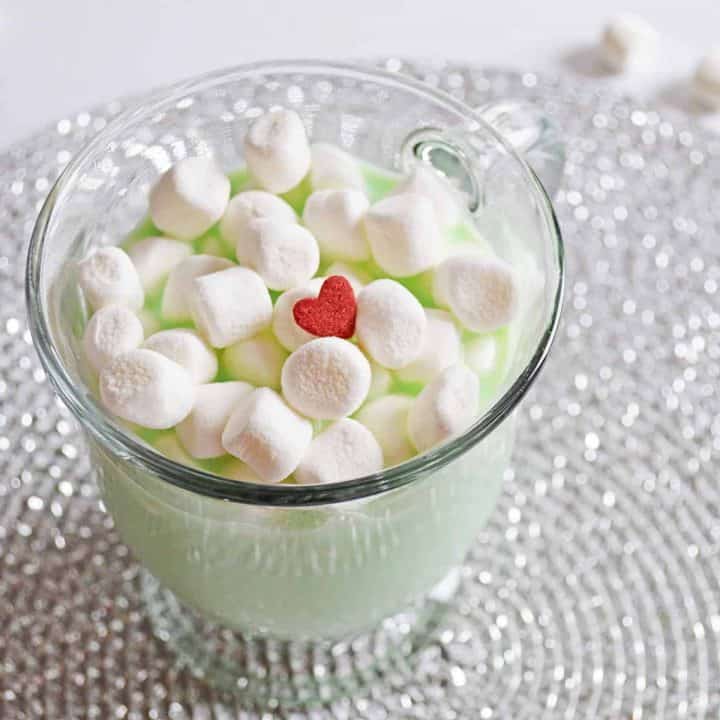 Warm up with a cup of Grinch-inspired white hot chocolate. Its cozy green color and whipped cream topping make it the perfect drink to enjoy while watching your favorite holiday movie.