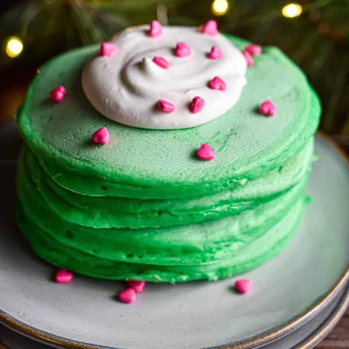 Start your holiday morning off with these fluffy and festive Grinch pancakes! Made from scratch, they are sure to impress even the pickiest of eaters. Plus, the bright green color is just too fun to resist.
