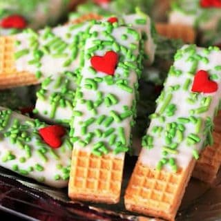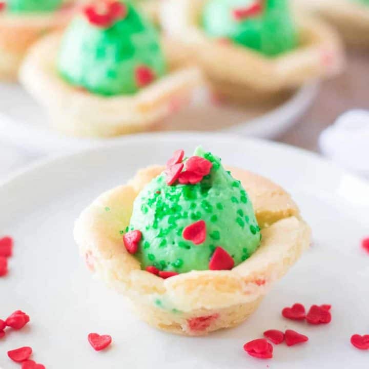 These cute and simple treats are perfect for kids to help make in the kitchen. Their green color and sprinkles make them a fun addition to any holiday dessert table.