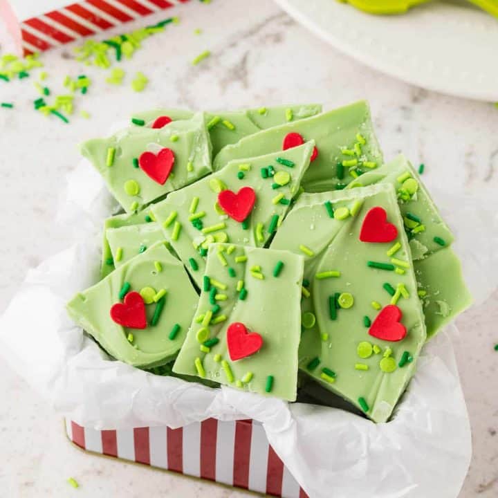 Bark is an easy and delicious treat to make for any occasion, and this Grinch-inspired version is perfect for the holiday season. With its layers of green chocolate, candy hearts, and sprinkles, it's a fun and festive addition to any dessert table.