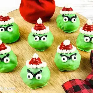 Oreo balls are a delicious and easy treat to make for any occasion, and decorated with white vanilla frosting to look like Mr. Grinch, they make the perfect addition to any holiday dessert table.