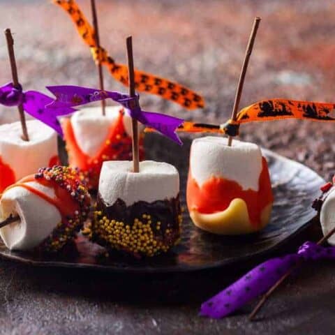 These marshmallow pops are dipped in chocolate and decorated with spooky designs like ghosts, bats, or pumpkins. They’re a fun and easy treat that’s perfect for kids and adults alike.