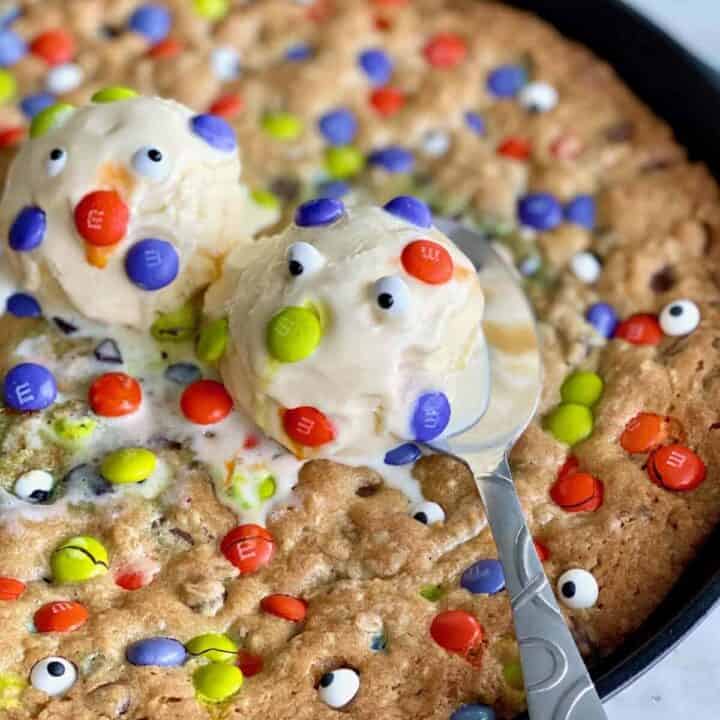 This giant skillet cookie is filled with Ghoul Mix M&M's. It’s a deliciously creepy dessert perfect for sharing at your Halloween gathering.