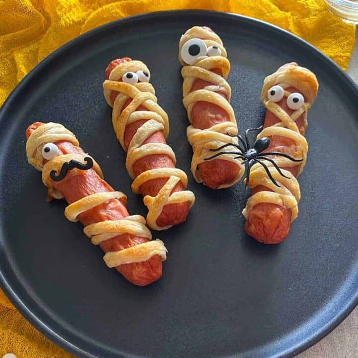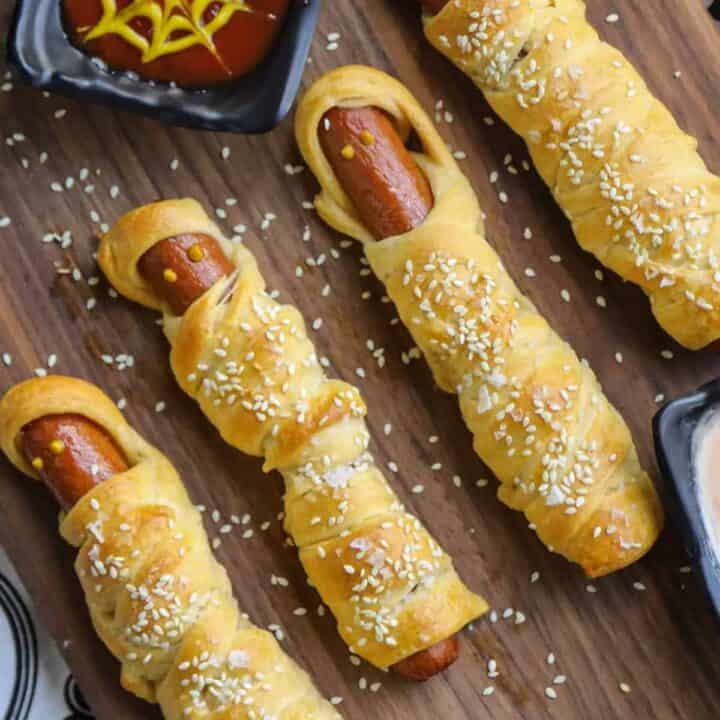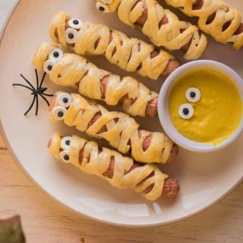 Wrap your hot dogs in crescent dough to create these adorable and spooky mummy dogs. A fun treat for kids and adults alike, these mummies are quick to make and perfect for a Halloween party snack.