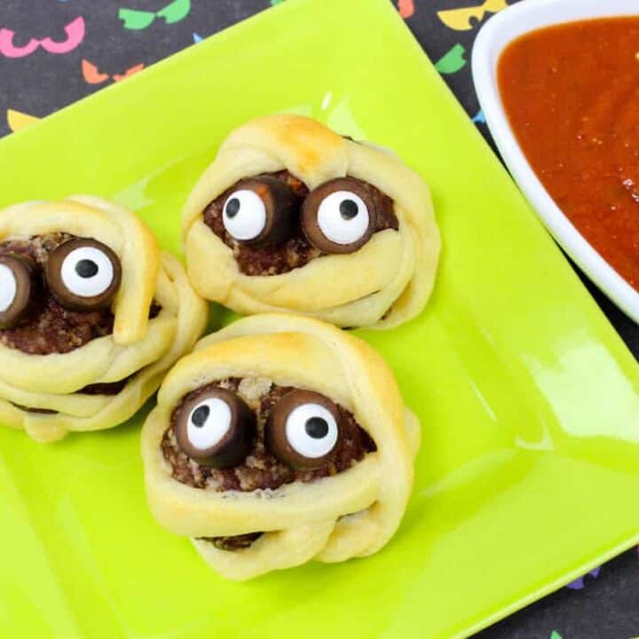 These mummy jalapeno poppers bring the heat with spicy jalapenos stuffed with cheese, then wrapped in crescent dough to create a mummy effect. With just the right amount of kick and a spooky presentation, they’re an irresistible snack for your Halloween party.