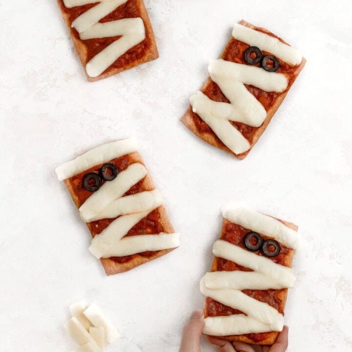 These mini pizzas use cheese to resemble mummies, complete with olive eyes peeking out. They’re a quick and easy way to add some Halloween fun to your dinner table.