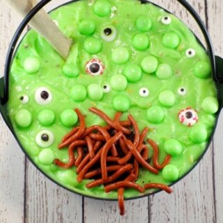 This Spumoni trifle combines delicious layers of cake, pistachio pudding, whipped cream, and cherry almond cream cheese, topped with mint eyeballs, bubbles, and jello worms. It’s a rich and indulgent dessert that’s sure to cast a spell on your Halloween guests.