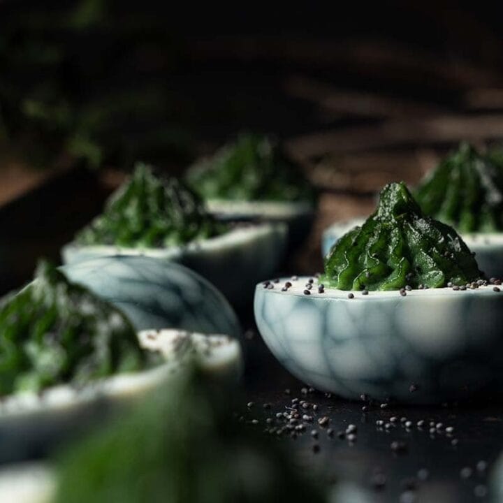 These deviled eggs are naturally dyed to give them a swampy, eerie appearance. Filled with a tangy yolk mixture, they’re a spooky yet sophisticated appetizer that’s sure to impress.