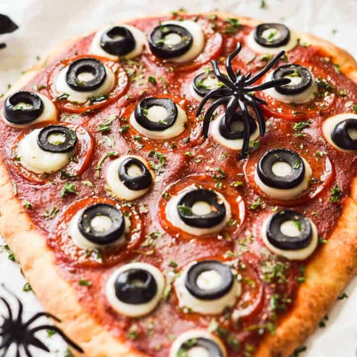 This pizza is topped with cheese, olives, and pepperoni arranged to look like monster eyes, making it a fun and frightening main dish. It’s a simple yet effective way to bring some spooky vibes to your meal.