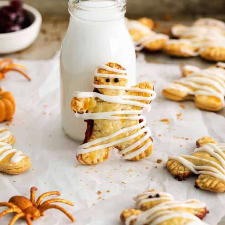 These hand pies are both creepy and delicious, with a flaky crust and your choice of sweet or savory fillings. Shaped like mummies they’re a great grab-and-go treat for your Halloween guests.
