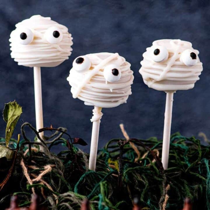These cake pops are wrapped in white chocolate to look like mummies, complete with candy eyes. They’re a fun and bite-sized treat that’s perfect for Halloween parties.