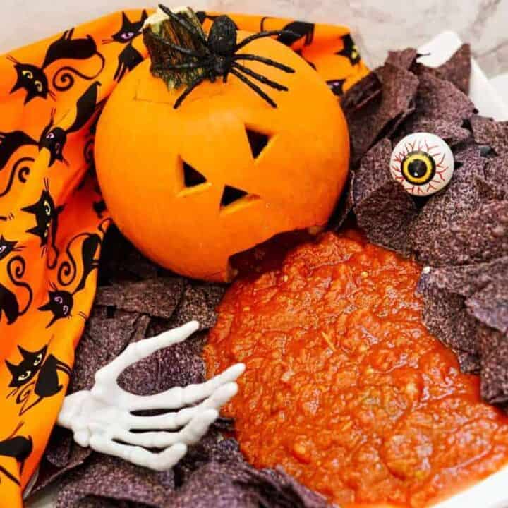 A hilariously gross centerpiece, this puking pumpkin platter serves up chips and salsa in a way that’s sure to get a few laughs (and maybe some gags). The carved pumpkin "vomits" salsa onto a plate surrounded by chips, making it a fun and festive addition to your Halloween spread.