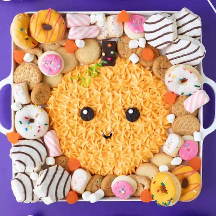This Halloween pumpkin frosting board is a creative and interactive dessert. It is perfect for sharing, and it invites guests to dip, spread, and enjoy a sweet and festive treat.