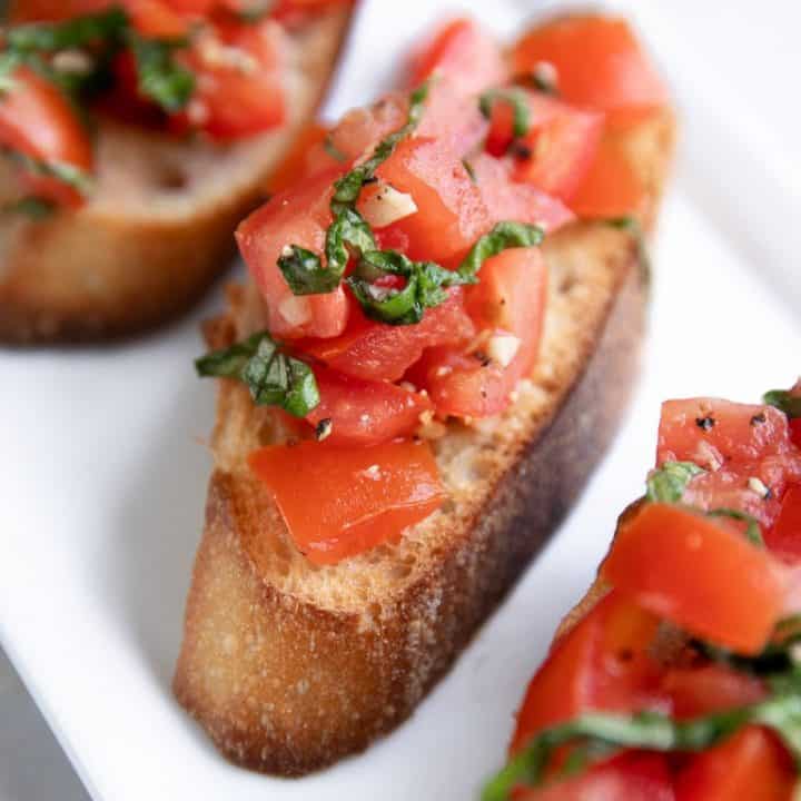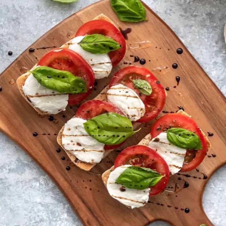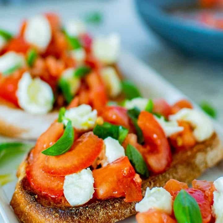 Bruschetta with mozzarella is easy and comes together in just 15 minutes. It’s perfect for a crowd with amazing rustic flavors like tomato, basil, and garlic.