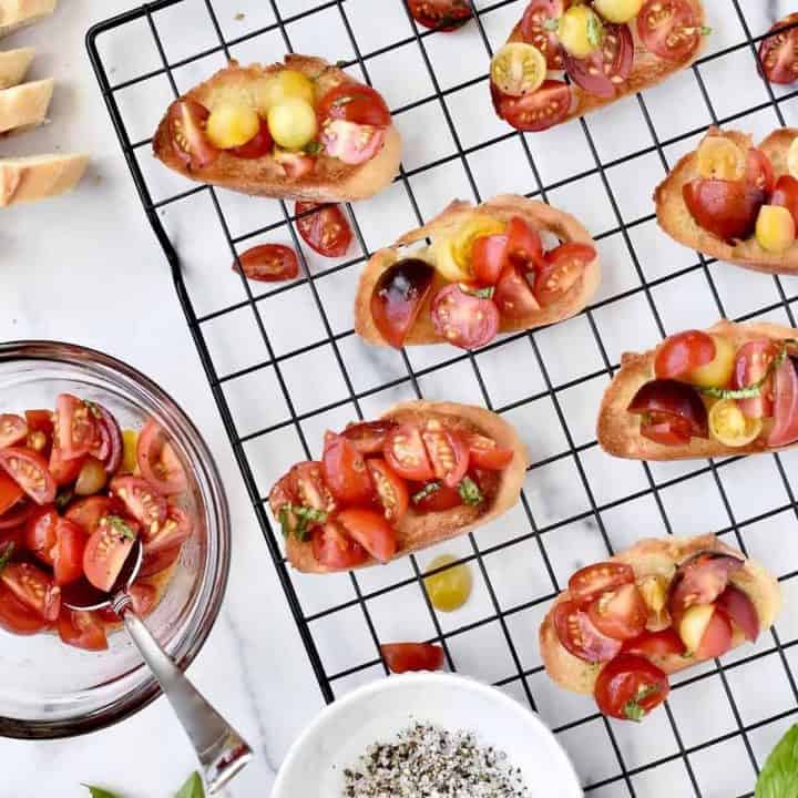 Cherry tomatoes are so fun and tasty with bruschetta. Plus it’s a great party appetizer for a crowd to enjoy while you're grilling or making cocktails.