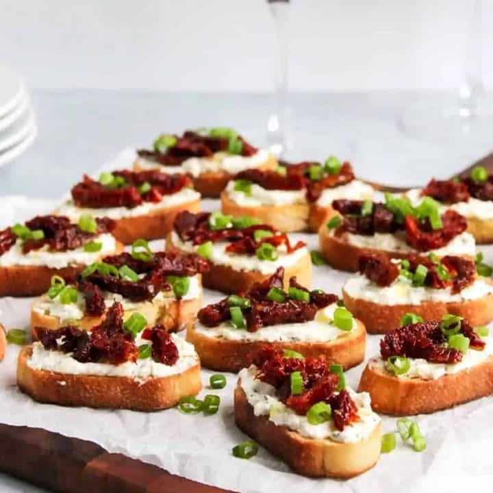 Italian appetizers like Sun-Dried Tomato Crostini are sure to please your guests. Everyone will love the flavorful combination of sun-dried tomatoes, various cheeses, basil, and a hint of garlic.