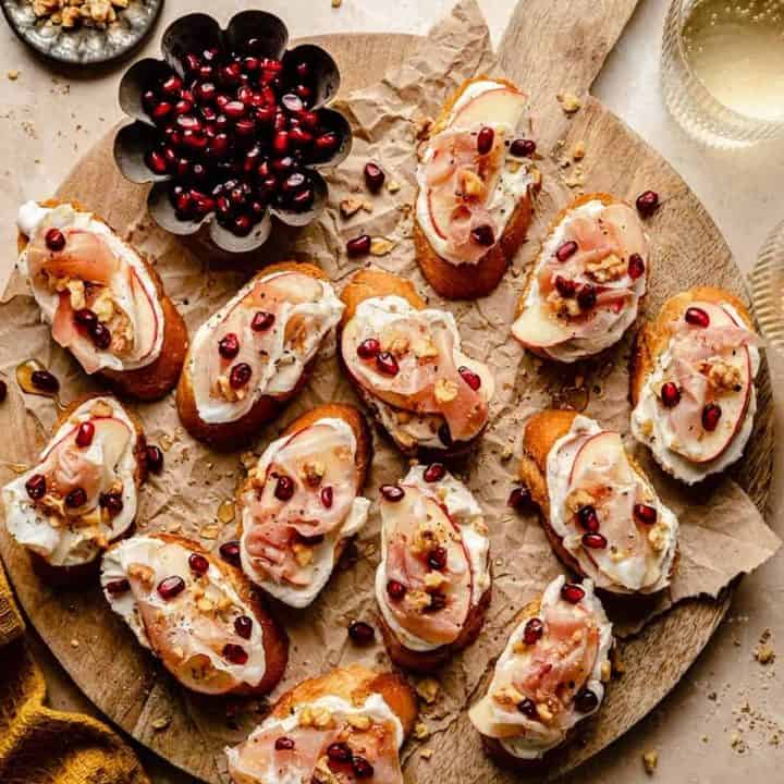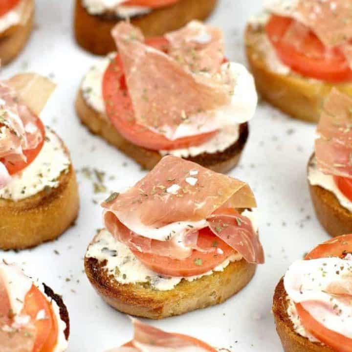 Italian appetizers like crostini with prosciutto are elegant and easy to prepare. With crispy toasted slices of baguette topped with prosciutto, tomato, and Boursin garlic and herb cheese and finished with Herbs de Provence and sea salt.