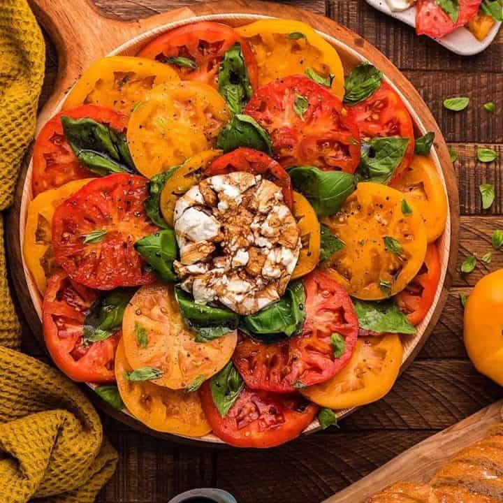 When you prepare this heirloom Italian burrata caprese salad, everyone will be impressed! It’s an amazing side dish or appetizer with balsamic vinegar and truffle salt.