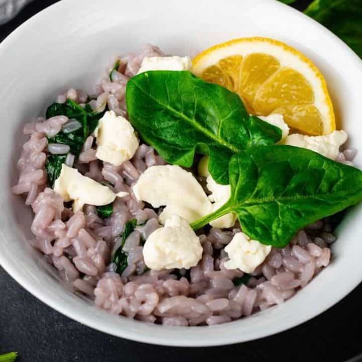 Risotto is lovely with spinach and goat cheese! Serve it as an appetizer or side dish for a busy weeknight or even Sunday dinner.