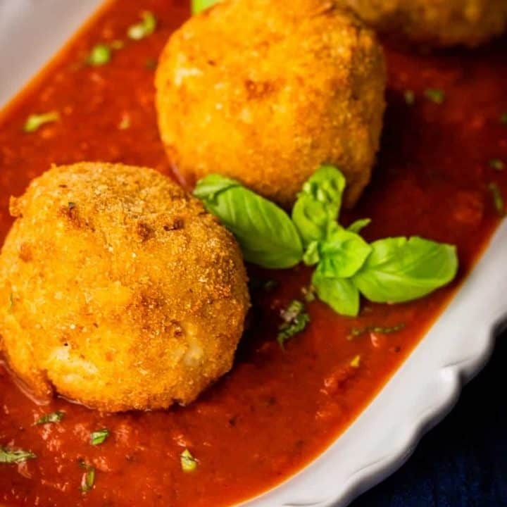 Italian rice balls are also known as arancini. They are a Sicilian classic with olive oil, arborio rice or short grain white rice, chicken broth, slightly beaten eggs, bread crumbs, and a few other pantry staples.