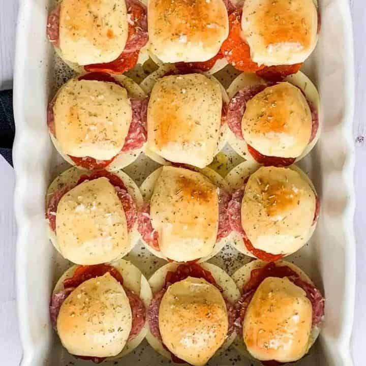 These sausage pizza bites are the best Italian appetizers. The personalized portions are fantastic for a party with homemade pizza sauce, mozzarella cheese, and hot Italian sausage with peppers.