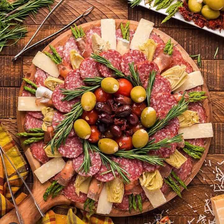 Make this Italian antipasto board for a dinner party or crowd. It’s super tasty, savory, salty, and there’s something for every palate, including cheese, deli meats, vegetables and a garlicky herb dressing.