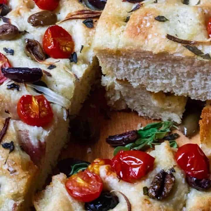 Focaccia, (aka) flat Italian bread, has a crispy outer layer and a soft and chewy center. Lightly coated in olive oil and coarse salt, you can eat it alone or with dipping sauce.