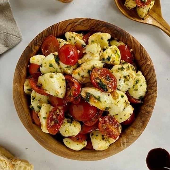 I adore Caprese recipes like this simple salad with balsamic vinegar. With other fresh ingredients like grape tomatoes, fresh mozzarella balls, olive oil, salt, garlic, and fresh basil.