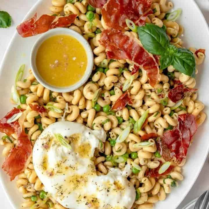 This pasta salad with peas, burrata, and prosciutto is out of this world amazing. The herby lemon vinaigrette and fresh and dried herbs will really put it over the top.