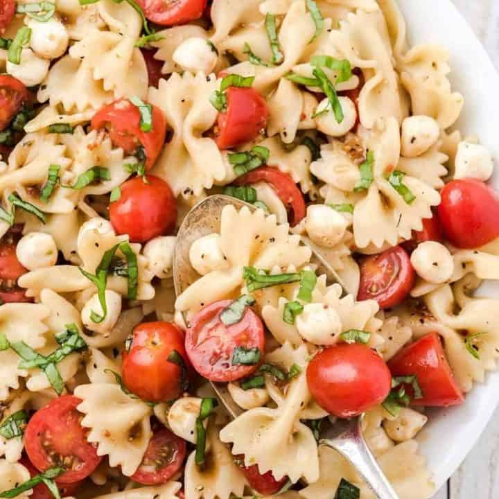 Caprese Pasta Salad is easy to make with traditional Italian flavors of Caprese filled with tomatoes, basil, and mozzarella! It’s quickly assembled into a pasta salad that is bright, sweet, and tangy.