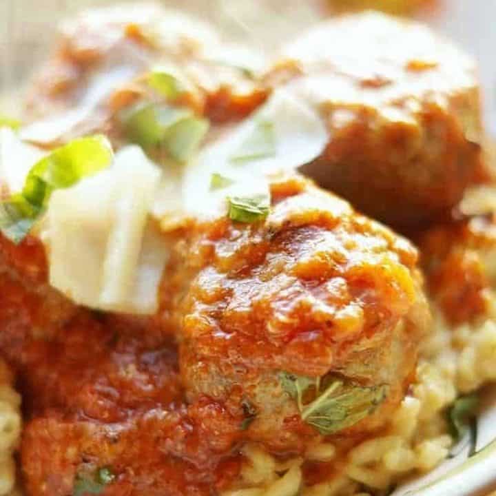 Italian pizza stuffed meatballs will quickly become your new favorite side dish. They are tender, stuffed with pepperoni and mozzarella cheese, and topped with sauce and fresh parmesan cheese!