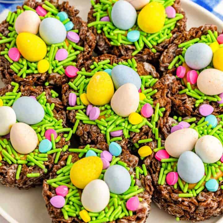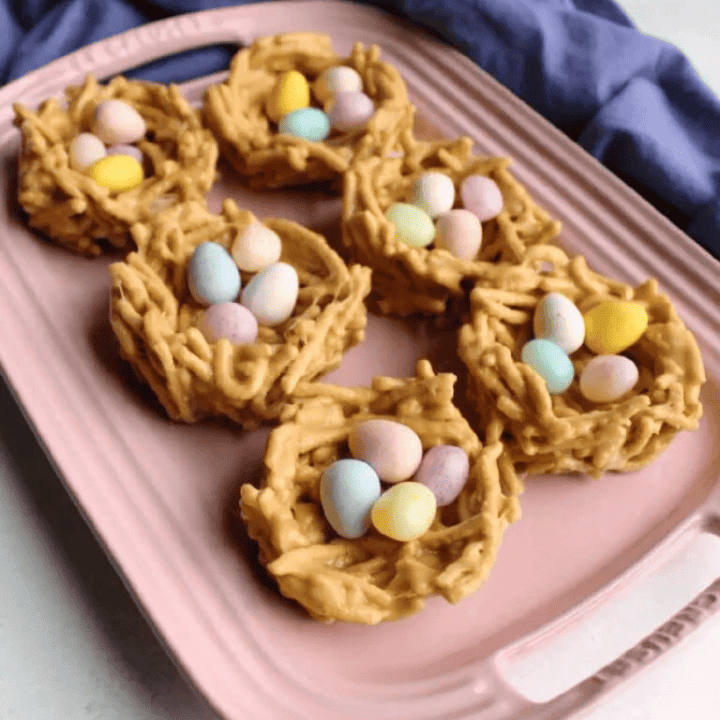 Formed into nests and then topped with candy eggs, this is the perfect easy Easter themed treat!