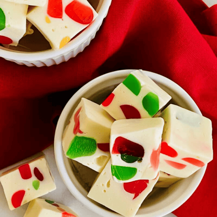 Tasty fun gumdrop nougat is an easy recipe that is a bit addicting. The creamy nougat speckled with fruity gumdrop candies is white and bright for a gorgeous, sweet treat.