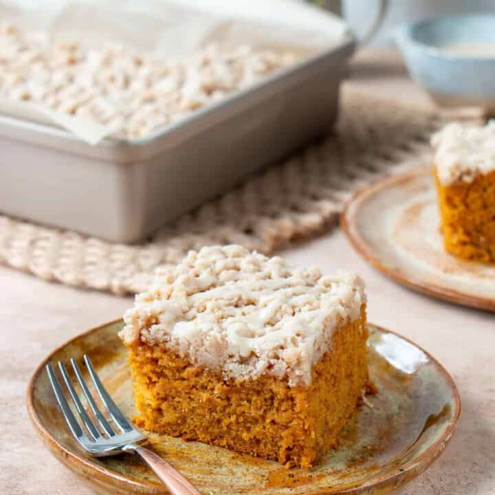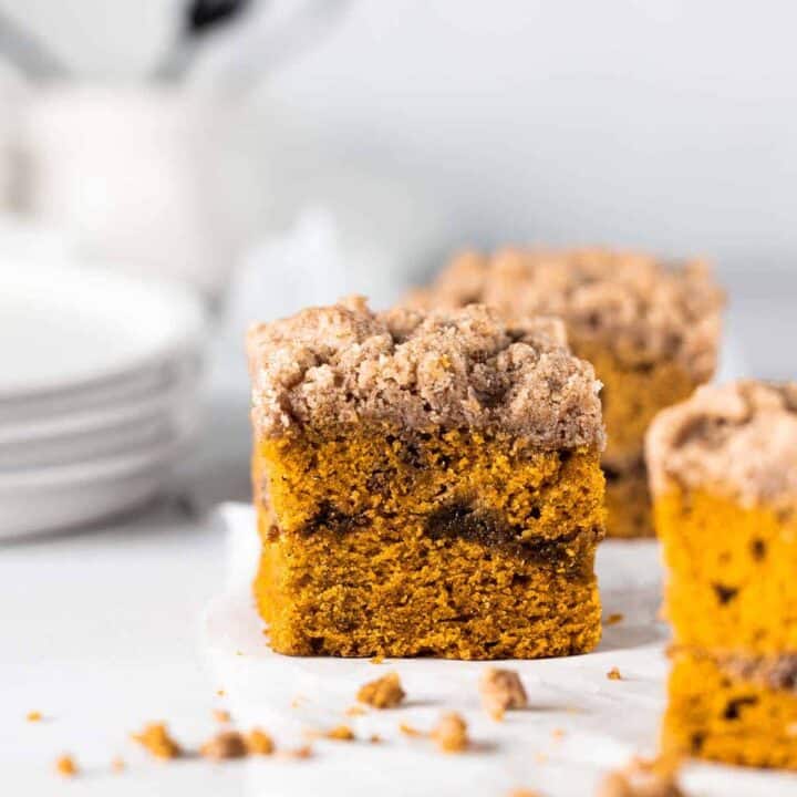 True to its name, this Super Moist Pumpkin Coffee Cake is incredibly tender and delicious. It's a perfect breakfast or brunch treat topped with a crunchy streusel and a sweet glaze.