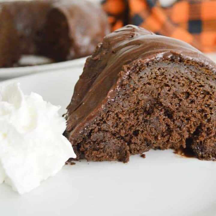 This spruced-up chocolate cake is moist, decadent, and topped with chocolate fudge frosting. It's easy and perfect for Fall.