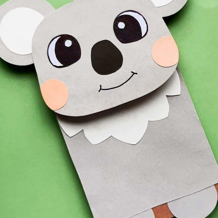 Turn an ordinary lunch sack into an adorable koala with this easy printable template. The big nose and fluffy ears make this puppet extra charming.