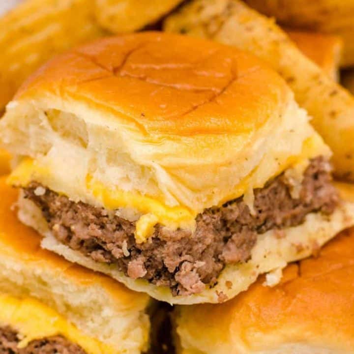 These cheeseburger sliders have never been easier. You can pile them up with all of the toppings you like for the perfect burger.