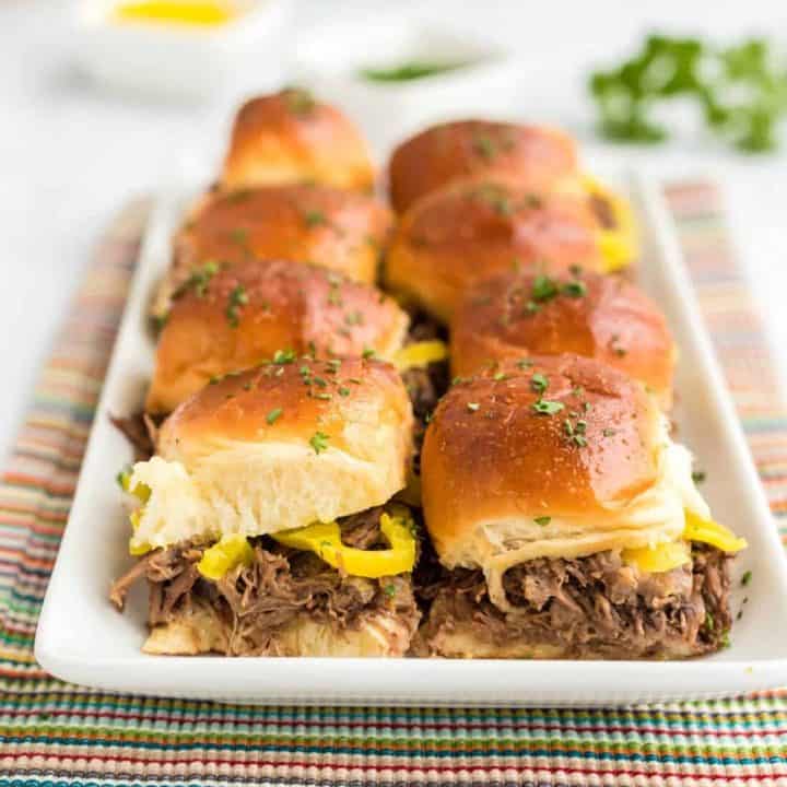 Tuck the flavor of everyone’s favorite pot roast into a soft bun for a great slider! The peppers are perfect on this little sandwich.