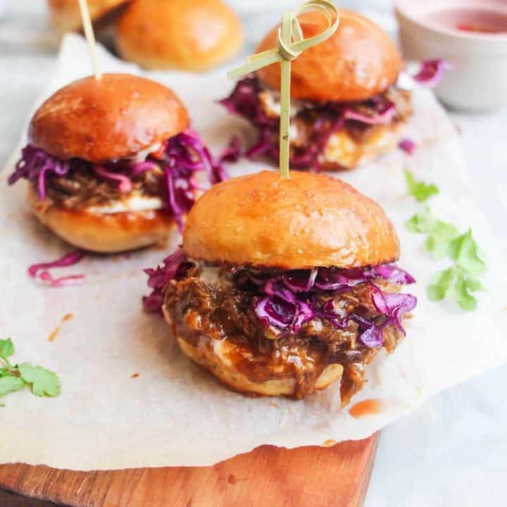 These sliders are made with pulled pork, and they are sticky and tangy and have such a good crunch, thanks to the coleslaw.