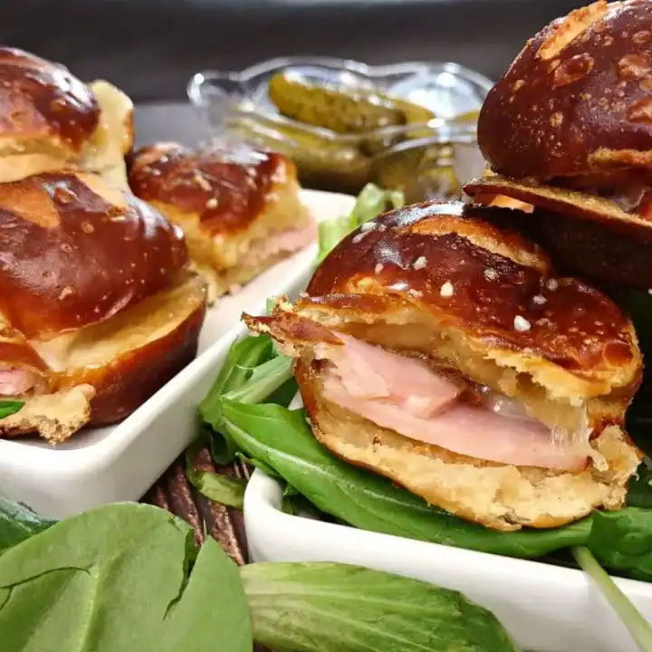 Chewy pretzel buns taste so good with melty cheese and savory ham. These are easy and fast made in the air fryer!