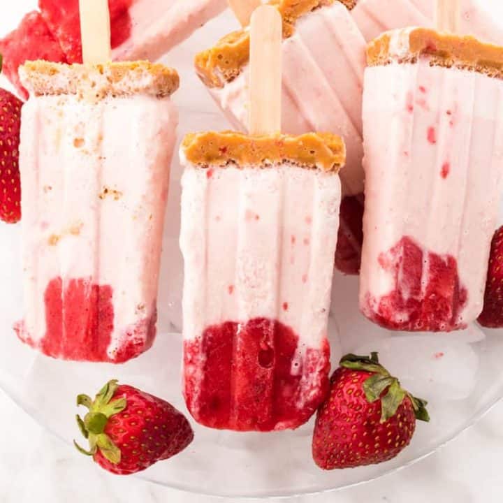 These Strawberry Cheesecake Popsicles are the perfect choice when you are craving cheesecake but want a lighter treat. All the flavors of cheesecake lightened-up, including a strawberry topping and a graham cracker crust.