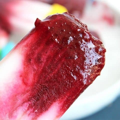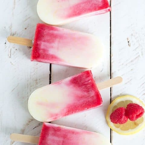 These pops pack a punch of slightly tart, creamy, and fruity flavor! My favorite part about these popsicles is the swirl where the raspberry puree and lemonade yogurt meet.